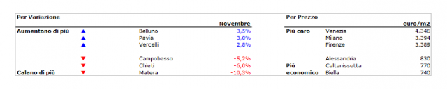 In netta diminuzione i segni meno anche a livello dei capoluoghi, con 53 centri in calo sui 105 rilevati a ottobre. I centri di grandi e medie dimensioni si distinguono per una maggiore compattezza intorno ai valori mediani, mentre i piccoli centri sono ancora soggetti a variazioni più ampie come testimoniano le performance negative di Matera (-10,3%), Chieti (-6%) e Campobasso (-5,2%) da un lato, Belluno (3,5%) e Pavia (3%) dall’altro.