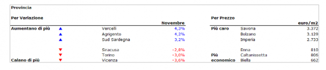 Il ranking delle province più care vede il dominio di Savona (3.372 euro/m2), davanti a Bolzano (3.129 euro/m2) e Imperia (2.733 euro/m2), mentre, nella parte bassa della scala dei valori immobiliari, stazionano Enna (810 euro/m2), Caltanissetta (806 euro/m2) e Biella (662 euro/m2).