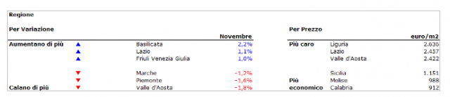 La Liguria resta la più cara, con una media di 2.636 euro al metro quadro, Lazio (2.457 euro/m2) e Valle d’Aosta (2.422 euro/m2)..La regione più economica è la Calabria (912 euro/m2), seguita dal Molise (988 euro/m2) e dalla Sicilia (1.151 euro/m2).